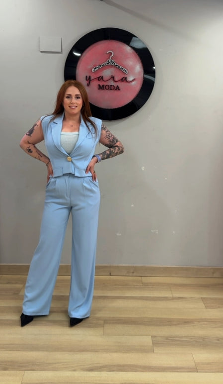 El diseño sin mangas del chaleco con solapa amplia y botón dorado central añade un toque sofisticado, mientras que el pantalón de tiro alto con corte recto y goma en cintura , por parte trasera , estiliza la figura y aporta comodidad.