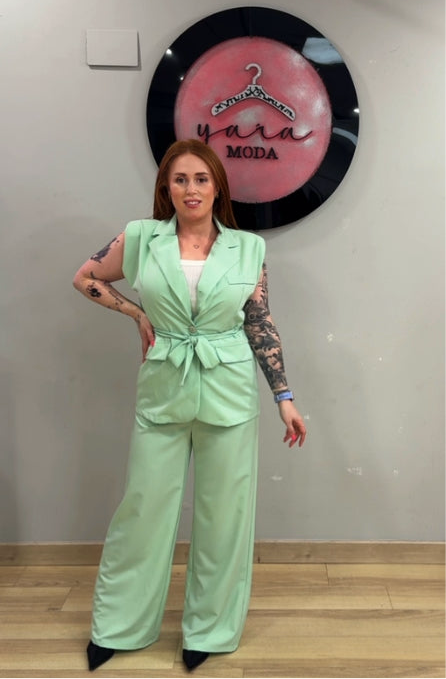 Compuesto por un chaleco largo sin mangas con solapa clásica y cinturón lazado a la cintura, define la silueta con un toque femenino y estructurado.