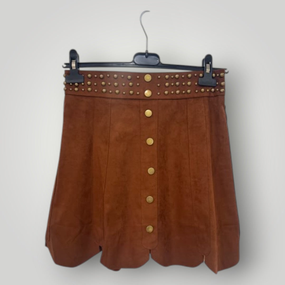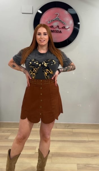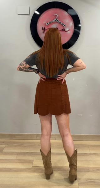 - Falda corta efecto ante: en tono marrón teja cálido y muy combinable.